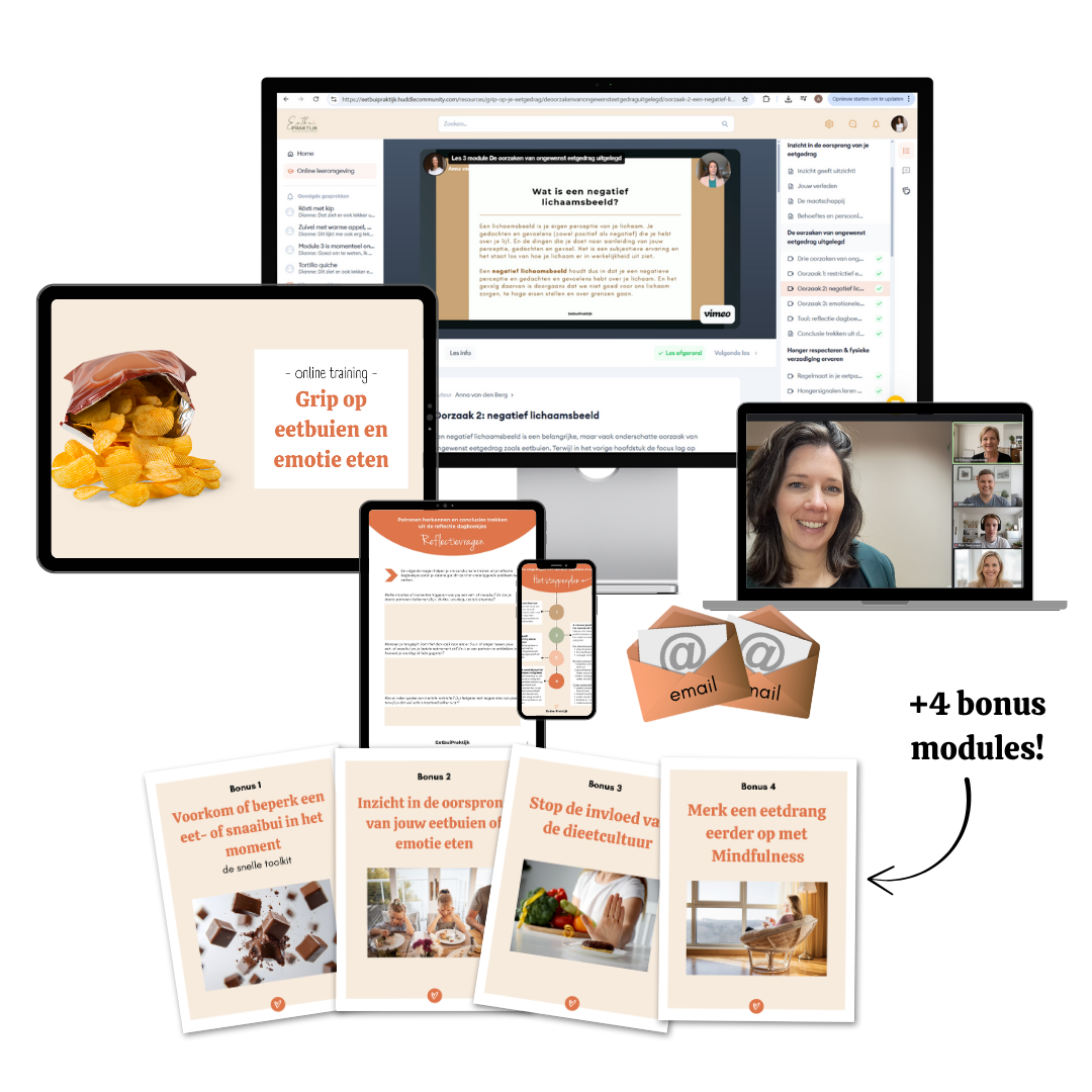 Je werkt daarnaast aan een positiever lichaamsbeeld, betere zelfzorg, meer zelfcompassie en een voedzamer eetpatroon. En dan komt de rust terug, ben je minder met eten bezig en zul je merken dat je prima in staat bent om wat lekkers te eten zonder de hele verpakking leeg te eten.